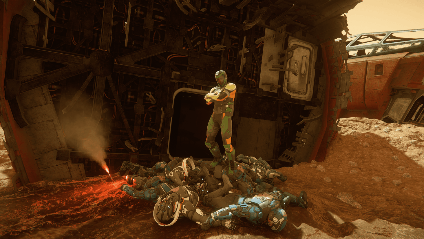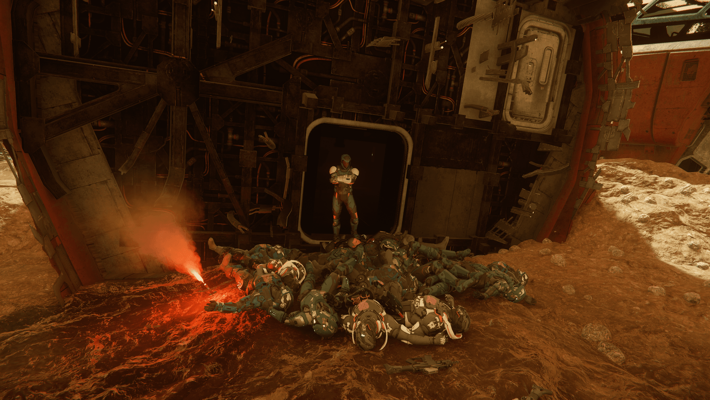 Clearing derelicts with a ship and on foot in the lucky Stella Fortuna colors- quite a few baddies! The other photos show just how many.