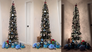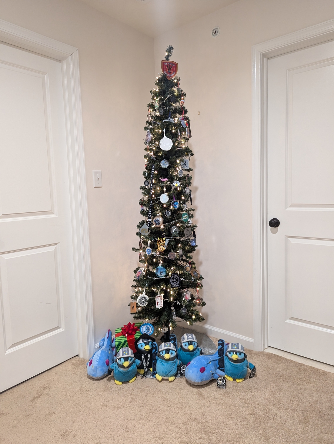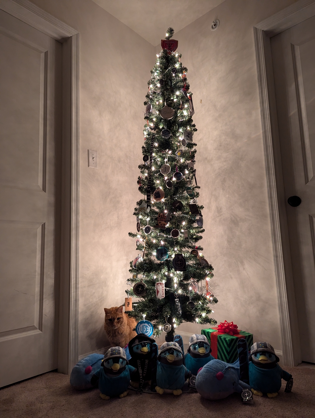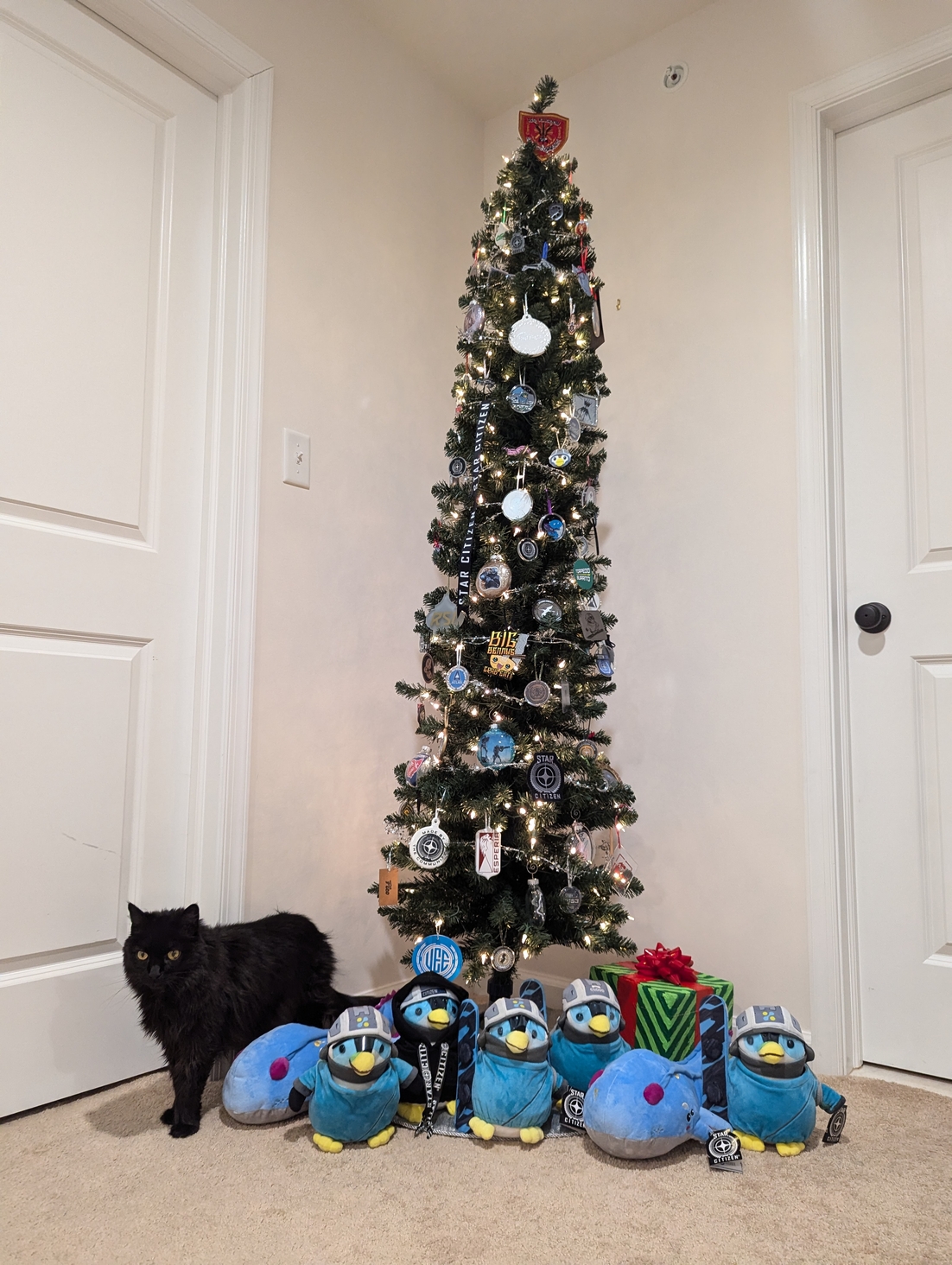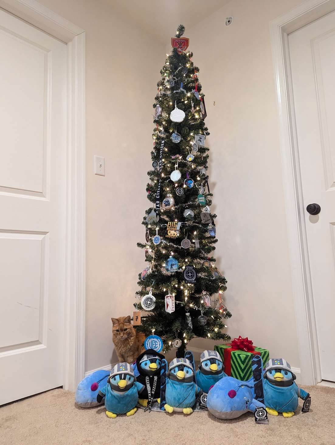 2954 Star Citizen themed Christmas tree keeps expanding. We also had a helper with the presents under the tree π»