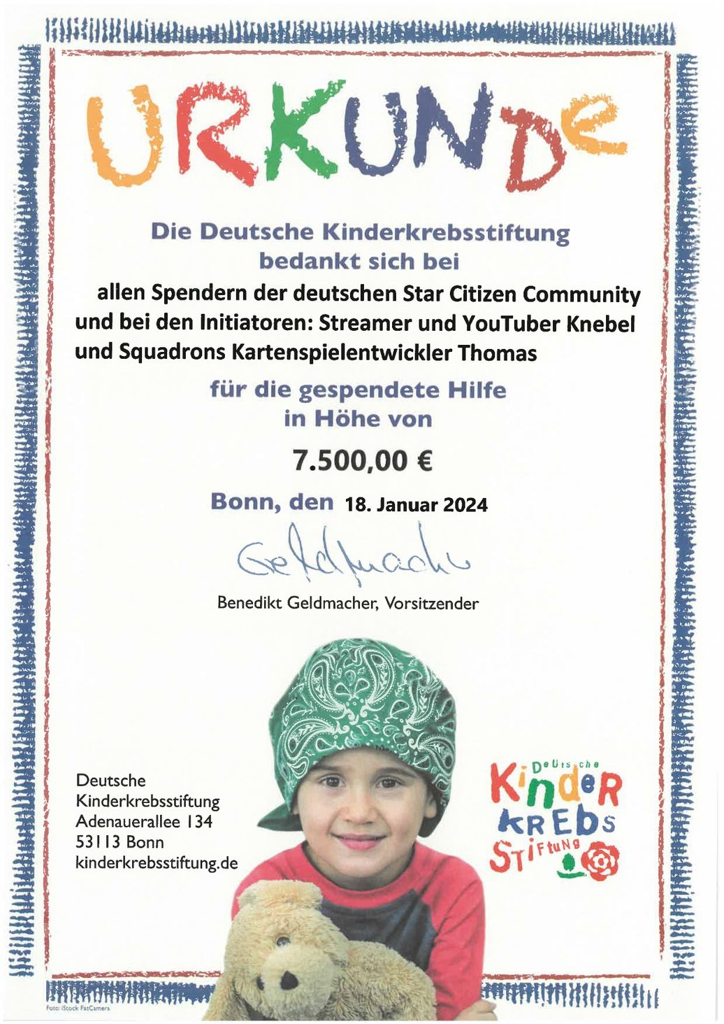 From the Stars to the Heart: Star Citizen Community's Generous €7,500 Donation to the German Children's Cancer Foundation
