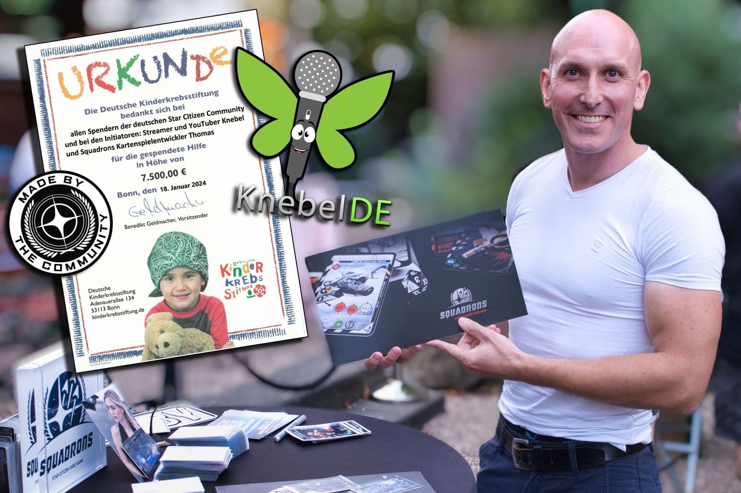 "Star Citizen – the name of the largest crowdfunding project in history. It's a space simulation game, whose development is entirely funded through donations from a large and loyal fan community. Last year, this community demonstrated its remarkable generosity in a fundraising livestream for the German Children's Cancer Foundation. The charity event was not only organized by KnebelDE, one of the largest German-speaking Star Citizen streamers, but also by game author Thomas Eberhard. The 39-year-old police officer from Rhineland-Palatinate, a passionate Star Citizen fan, has been developing the Star Citizen SQUADRONS Card Game since 2018 under a non-commercial license, creating a unique collectible card game. It was a true fan project, but the charity livestream was about more than just the game: 'We wanted to show that the story of Star Citizen and the SQUADRONS collectible card game is one of passion, community, and generosity, and that we can indeed make the world a little better. That's why we collected donations for children and adolescents with cancer,' says Thomas Eberhard. The event's initial donation goal was set at €2,500. 'But we surpassed that goal in just 20 minutes,' notes Eberhard. In the end, €7,500 were raised for the German Children's Cancer Foundation. 'A generous gesture that showcases the big heart of this gaming community,' says Dr. Dirk Hannowsky, CEO of the German Children's Cancer Foundation."