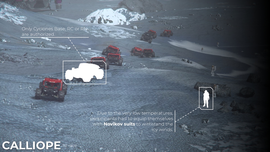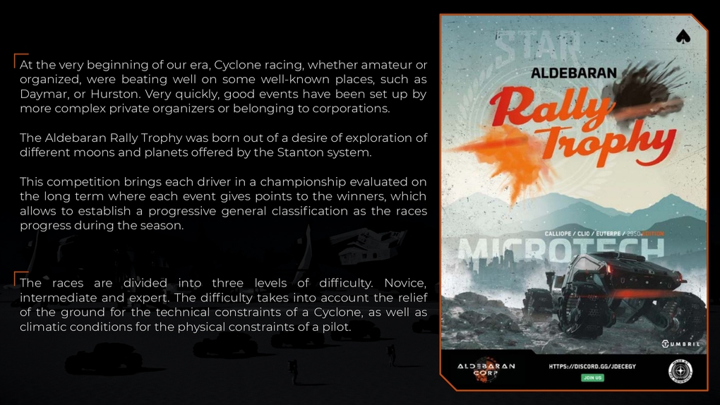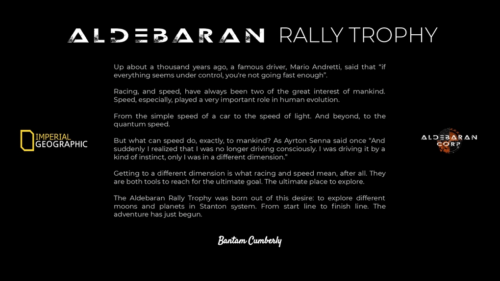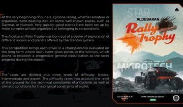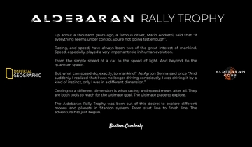 Getting to a different dimension is what racing and speed mean, after all. They are both tools to reach for the ultimate goal. The ultimate place to explore. The Aldebaran Rally Trophy was born out of this desire: to explore different moons and planets in Stanton system. From start line to finish line. The adventure has just begun.