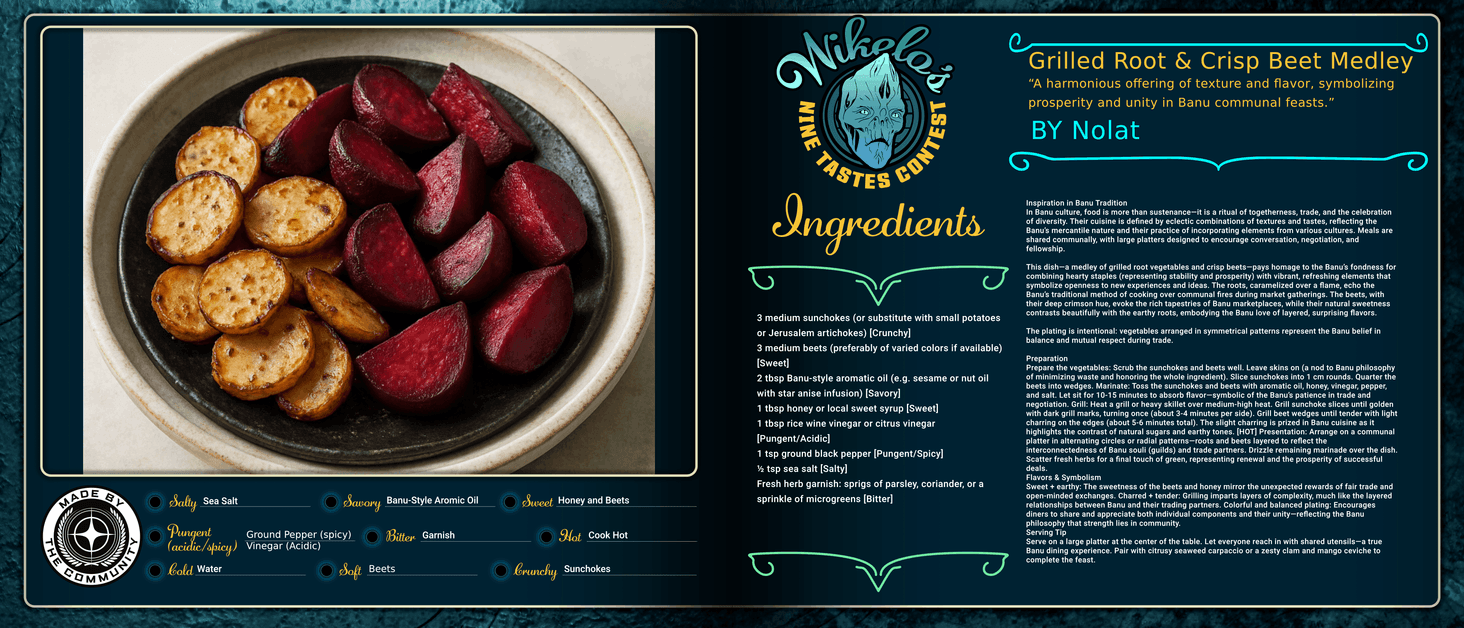 Prepare the vegetables: Scrub the sunchokes and beets well. Leave skins on (a nod to Banu philosophy of minimizing waste and honoring the whole ingredient). Slice sunchokes into 1 cm rounds. Quarter the beets into wedges. Marinate: Toss the sunchokes and beets with aromatic oil, honey, vinegar, pepper, and salt. Let sit for 10-15 minutes to absorb flavor—symbolic of the Banu’s patience in trade and negotiation. Grill: Heat a grill or heavy skillet over medium-high heat. Grill sunchoke slices until golden with dark grill marks, turning once (about 3-4 minutes per side). Grill beet wedges until tender with light charring on the edges (about 5-6 minutes total). The slight charring is prized in Banu cuisine as it highlights the contrast of natural sugars and earthy tones. [HOT] Presentation: Arrange on a communal platter in alternating circles or radial patterns—roots and beets layered to reflect the interconnectedness of Banu souli (guilds) and trade partners. Drizzle remaining marinade over the dish. Scatter fresh herbs for a final touch of green, representing renewal and the prosperity of successful deals.Flavors & Symbolism