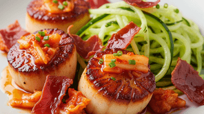 Prepare the Crispy Prosciutto: Preheat oven to 375°F (190°C). Lay prosciutto slices in a single layer on a baking sheet lined with parchment paper. Bake for 8-12 minutes, or until deeply golden brown and crispy. Remove from oven and let cool completely. Once cool, gently break into smaller, irregular pieces. Make the Kimchi-Maple Glaze: In a small saucepan, combine the finely chopped kimchi, maple syrup, soy sauce, rice vinegar, and gochujang (if using). Bring to a gentle simmer over medium-low heat, stirring occasionally, for 5-7 minutes, until the sauce thickens slightly and the flavors meld. Keep warm. Prepare the Chilled Cucumber Noodles: Using a spiralizer or a vegetable peeler, create long, thin ribbons or "noodles" from the English cucumber. In a medium bowl, gently toss the cucumber noodles with sesame oil, rice vinegar, red pepper flakes, and a pinch of salt. Place in the refrigerator to chill while you cook the scallops. Sear the Scallops: Heat olive oil in a large non-stick skillet over medium-high heat until shimmering. Season the patted-dry scallops generously with salt and pepper. Place the scallops in the hot skillet, ensuring they are in a single layer without crowding. Sear for 2-3 minutes per side, until a beautiful golden-brown crust forms and the scallops are cooked through but still tender. Avoid overcooking. **Assemble the Dish:**Divide the chilled cucumber noodles among four plates, forming a small nest. Arrange 3 seared scallops on top of or next to the cucumber noodles on each plate. Spoon a generous amount of the warm kimchi-maple glaze over the scallops. Crumble the crispy prosciutto over the scallops and glaze. Garnish with fresh cilantro leaves and a sprinkle of black sesame seeds, if desired.Flavor & Texture Breakdown: