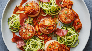 Wikelo approved Seared Scallops with Kimchi-Maple Glaze, Crispy Prosciutto, and Chilled Cucumber Noodles.