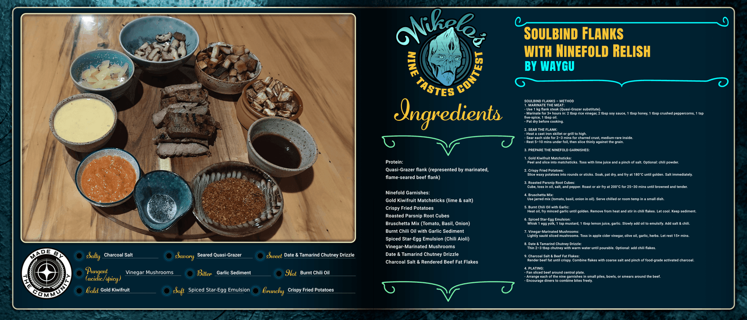 Once served only during Souli oaths of bonding, this preparation of Quasi-Grazer flank channels the Banu ideal of shared experience. Flame-seared with a resin spice rub traded from a Xi’an merchant-priest on Rā’puāng, each slice is meant to be dipped, layered, or crushed with any of the Ninefold Relishes surrounding it—a harmony of taste and texture forged by chaos and trade.