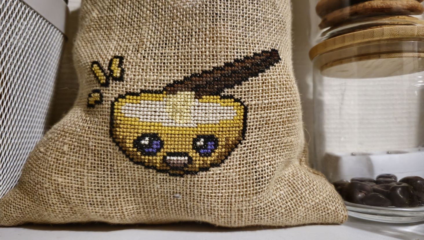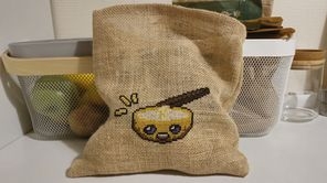 Big Benny's themed potato sack entirely handmade (Embroidery on burlap) by my girlfriend.