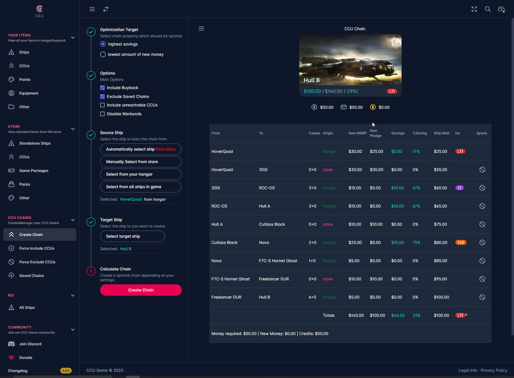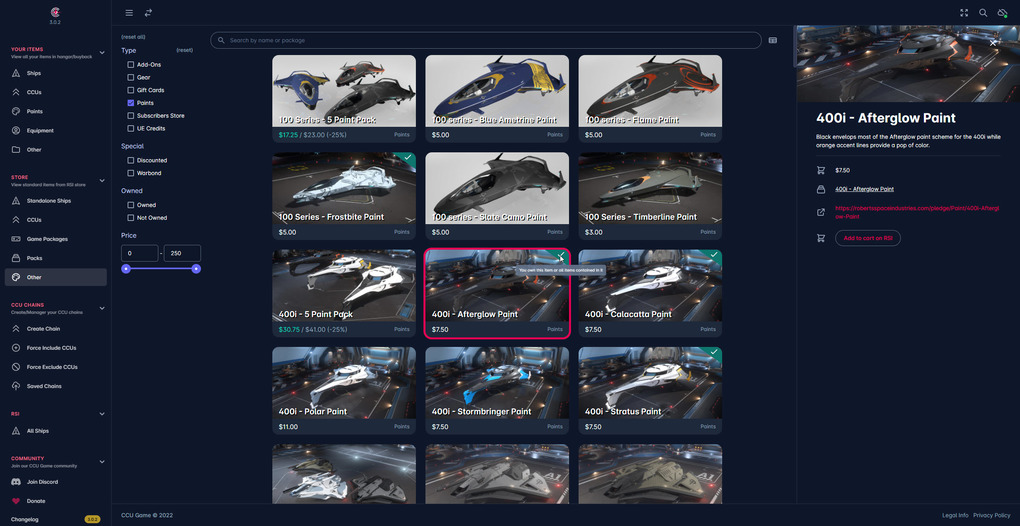 https://ccugame.app is a mobile friendly website which can give you a quickly searchable concise overview over all your hangar/buyback items and all currently available items in the store of robertsspaceindustries.com. Based on this data it allows for the automatic calculation of optimal CCU chains to create your dream fleet with a maximum amount of savings. You can upload your items into the cloud, so you can access your data from anywhere or you can use it in a local only mode where no data ever leaves your browser.