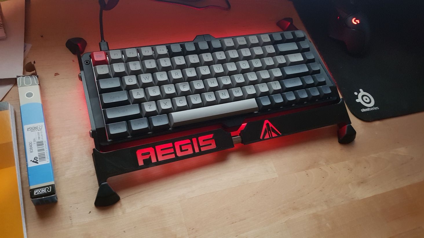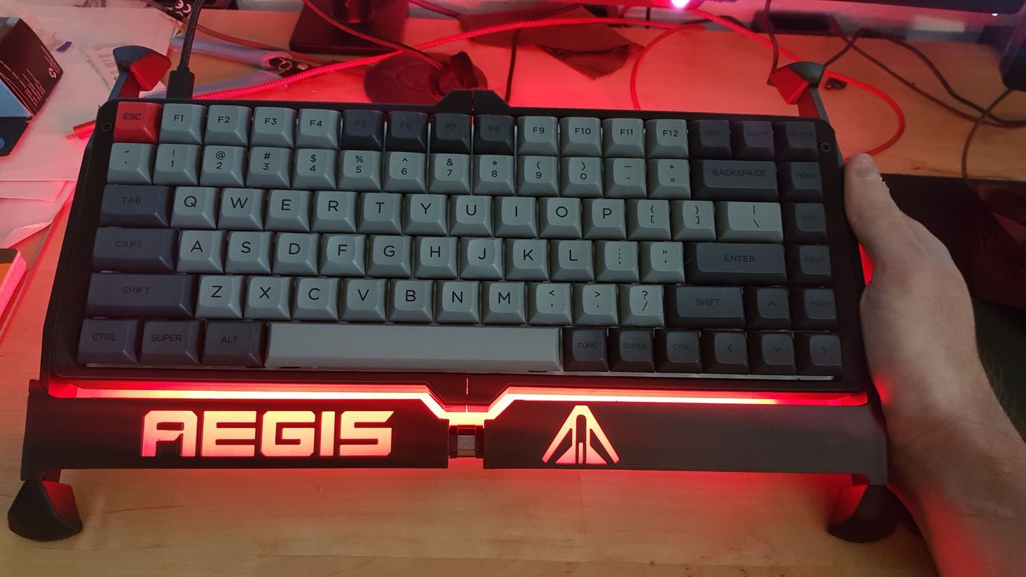 Hey, here's my custom Aegis mechanical keyboard. KBD75 PCB, cherry mx grey switches for the top row, brown for everything else. DSA DOLCH keycaps. 3D printed body with salvaged virpil parts.