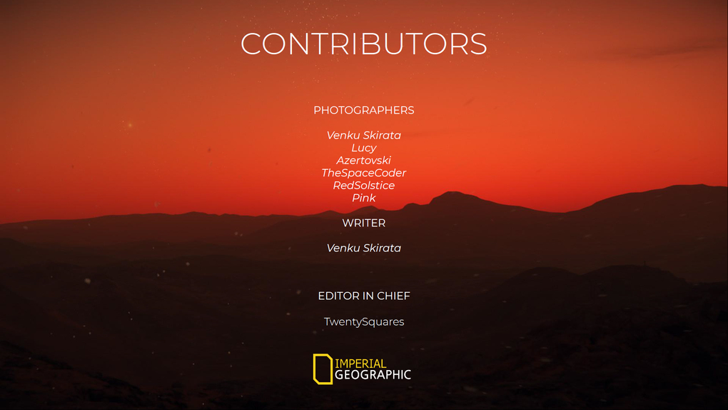 We are a non-profit scientific and educational organizations which operates within the UEE territory. Our interests include geography, archaeology, and natural science, the promotion of environmental and historical conservation, and the study of ‘Verse culture and history. IMPGEO revolves around exploration. All our job is focused on exploring new territories and, even better, getting to know the area of the ‘Verse we live in. Our fleet’s main goal is to reach the ultimate star and taking the ultimate shot while getting there. To us, destination is not so relevant. It’s the journey which matter the most.