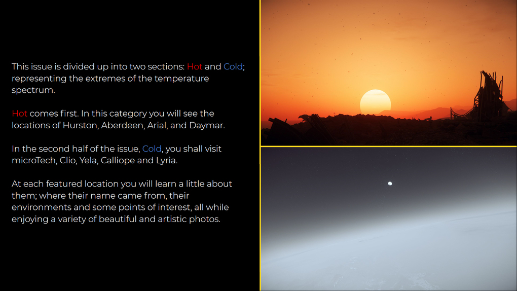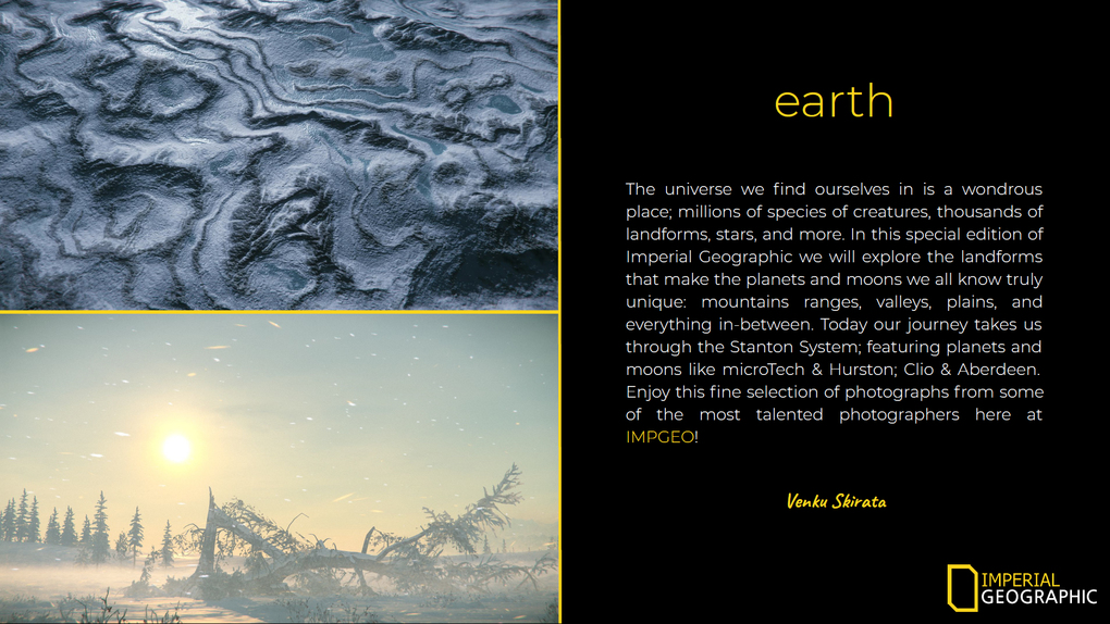 The universe we find ourselves in is a wondrous place; millions of species of creatures, thousands of landforms, stars, and more. In this special edition of Imperial Geographic we will explore the landforms that make the planets and moons we all know truly unique: mountains ranges, valleys, plains, and everything in-between. Today our journey takes us through the Stanton System; featuring planets and moons like microTech & Hurston; Clio & Aberdeen. Enjoy this fine selection of photographs from some of the most talented photographers here at IMPGEO!