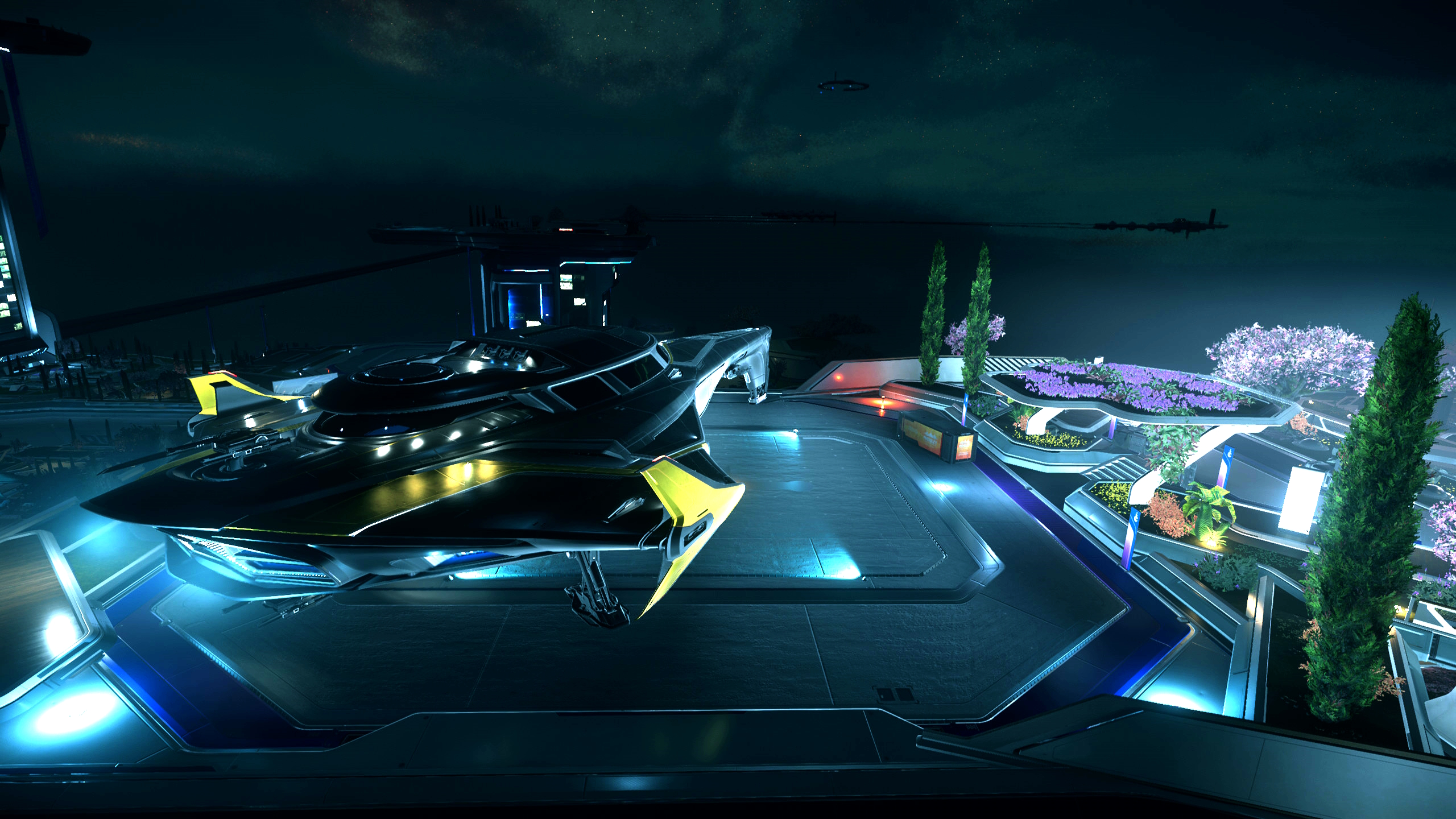 @SarahScarlet.Edited picture of a 400i landed on an atmospheric platform on Crusader, featuring the Penumbra paintjob.