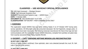 The exploration vessel UEEES Vara lost while orbiting Hades II on 27 October 2557 during early survey operations. All thirty-eight crew were presumed deceased a year later. No hull fragments, escape pods, or transponders have been recovered. The following transcript reconstructs the Vara’s final logs and last communications with the exploration vessel UEEES Discovery, compiled from partially corrupted data from recently recovered Rhetor Relay Satellite RS-225.