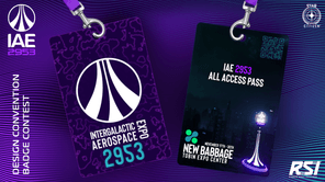 IAE 2953 Badge Contest entry #3: I focused on New Babbage as the theme, featuring the IAE colors and a topographical front to represent the mountainous planet with the back featuring the convention center and New Babbage skyline.