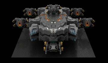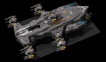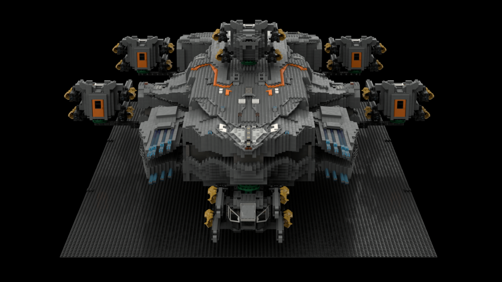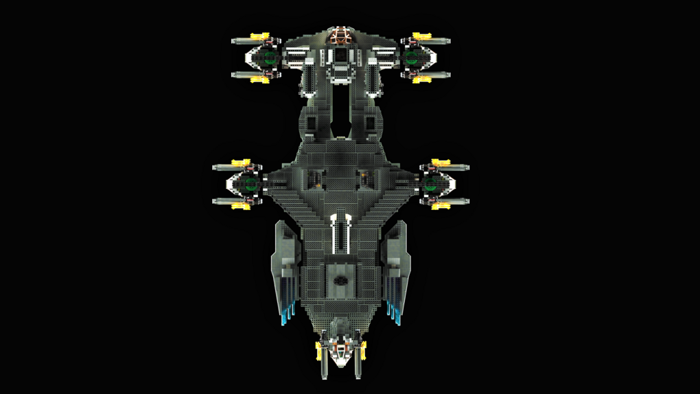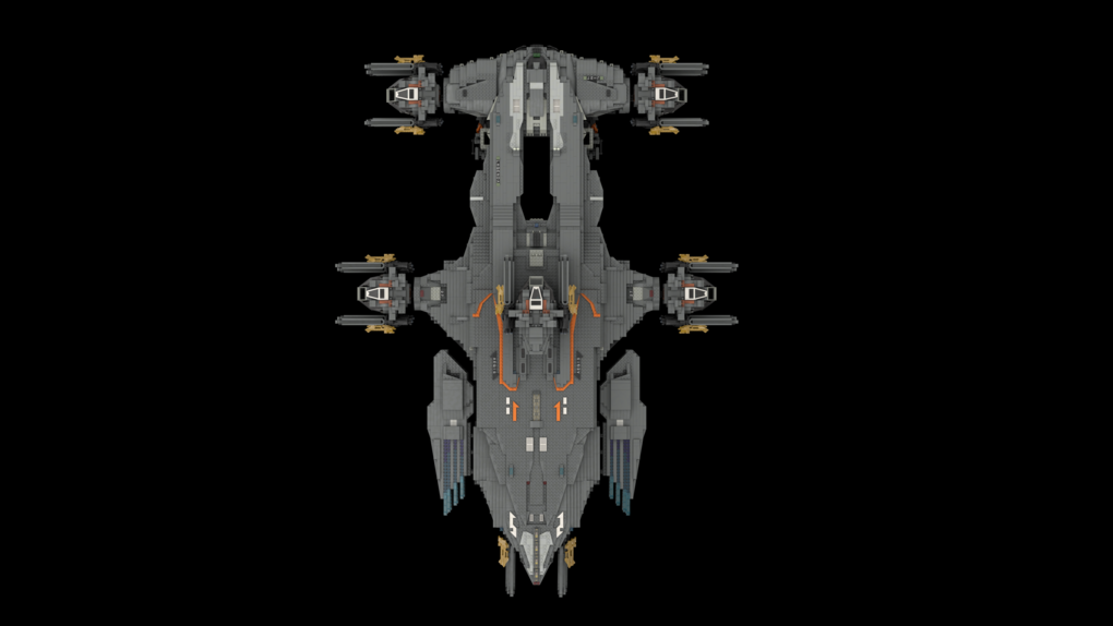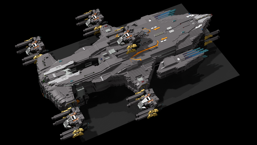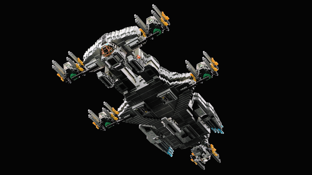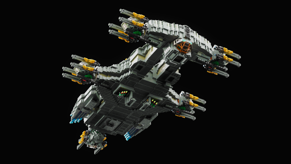 The MOC consist of 14327 parts in total. All shots rendered in 4K, IRL estimation size of the build is about 40 inches long in length, 15 inches tall in height & 20 KG in weight. Most parts of the ship you will be able to interact / remove, from turrets to the doors & thrusters.