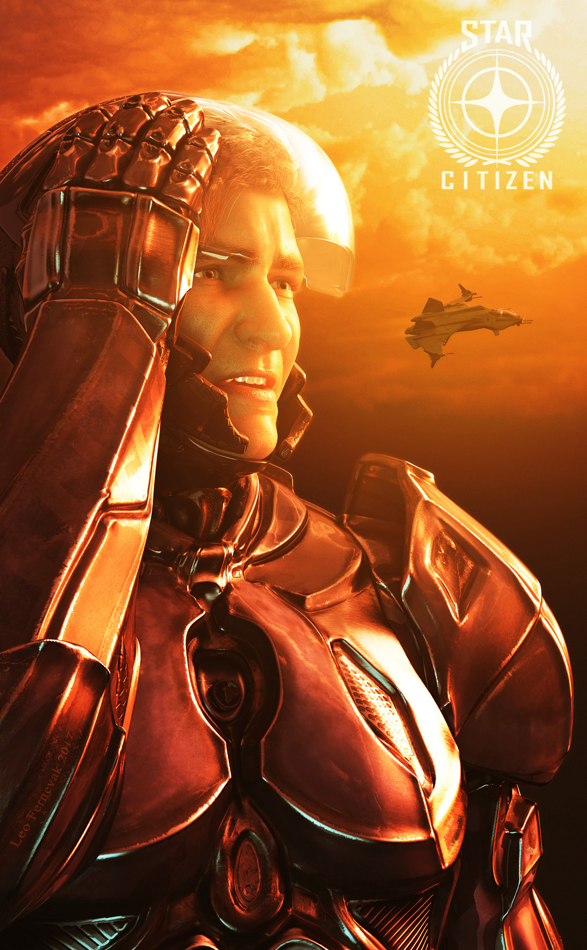 I used the Star Citizen holoviewer model of the Gladius starship with simple UV-mapping in Maya. For the armor I re-textured the Cyclops Suit by Luthbel and the helmet is from Titan Suit by Midnight Stories.