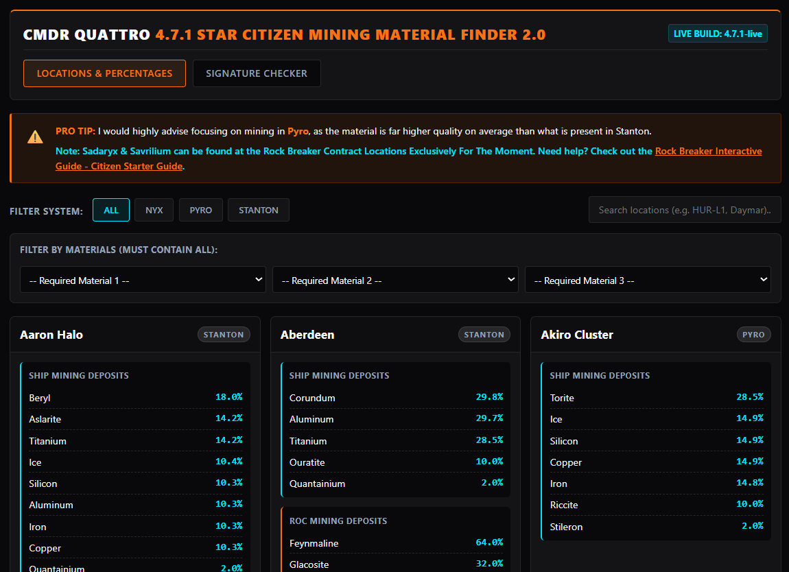 🚨 ALPHA 4.7.1 UPDATE: MINING MATERIAL FINDER 2.0 🚨 ########################################################################################### Just in time for the weekend, I've pushed a massive update to the site! The Mining Material Finder has been officially upgraded to 2.0 and fully updated for the Alpha 4.7.1 live build.