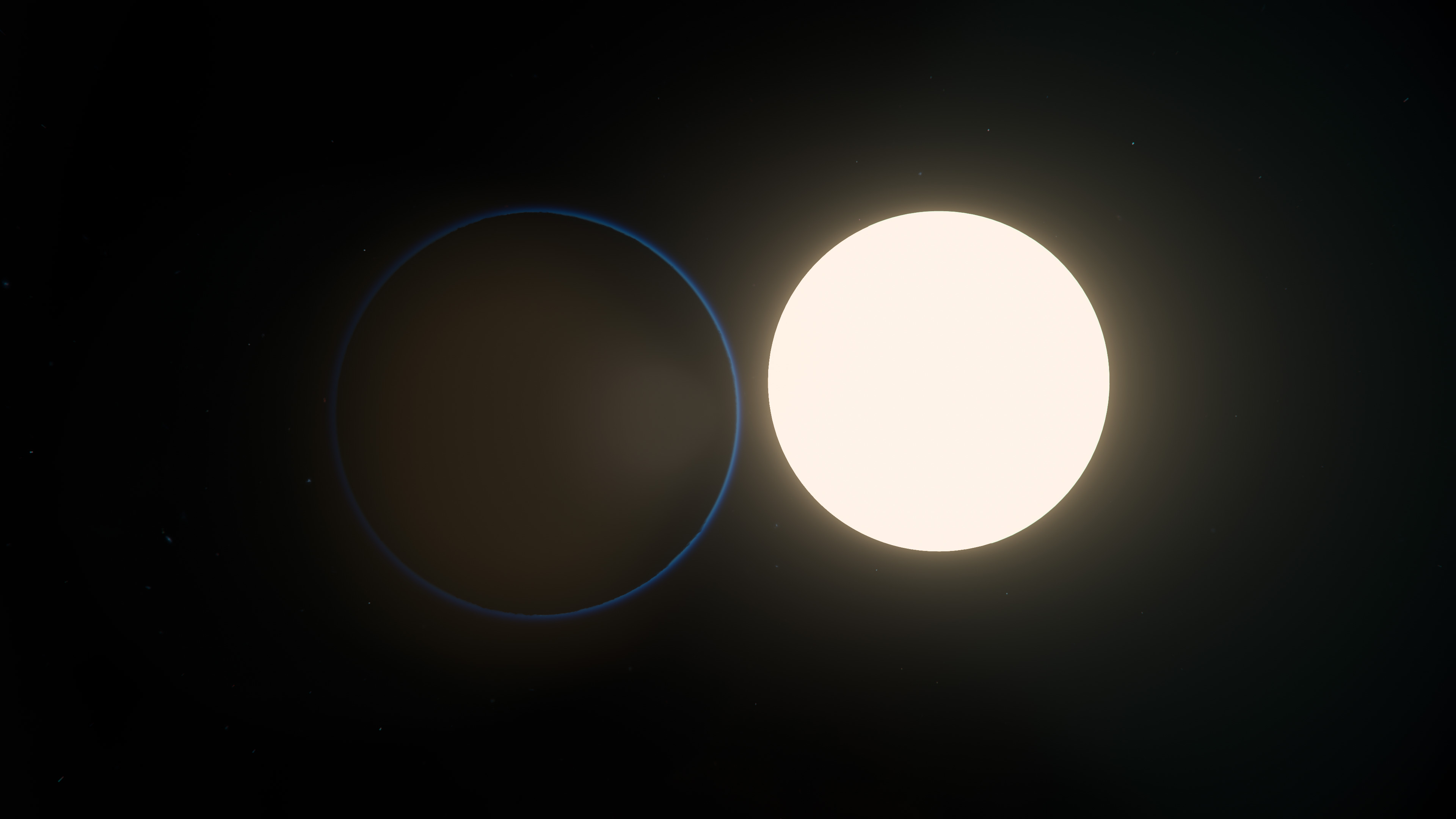 Amid the vast expanse of the Pyro system, Pyro 1 reveals its haunting beauty. Shrouded in darkness, the planet is delicately outlined by a faint blue glow, as the Pyro star casts its light across the void.