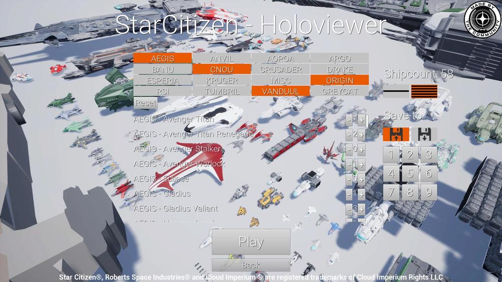 The update V3.1 of the Star Citizen Holoviewer is now available. The update brings 6 new Ships It also brings the possibility to Save and Load up to 9 Shiploadouts for the Customemode.