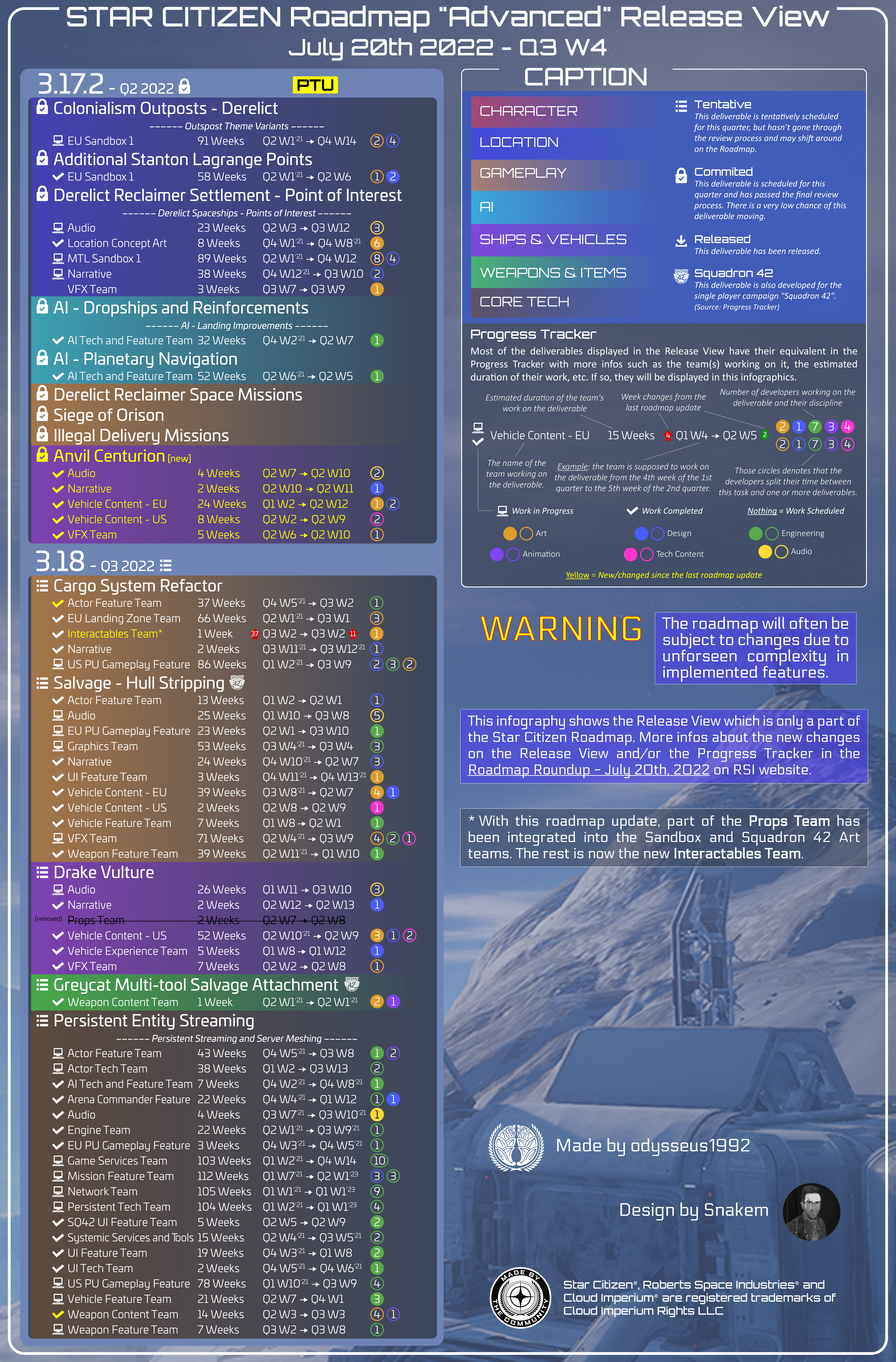 My name is Odysseus and each week since the beginning of 2018, I’m condensing and sharing the updates of the Star Citizen Roadmap with a design that allows everyone to see weekly changes at a glance!