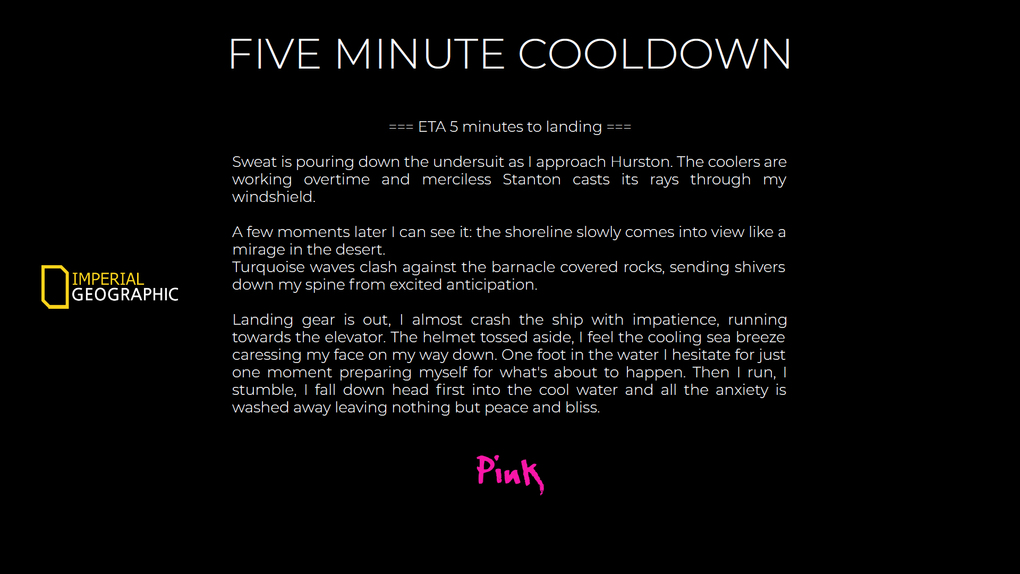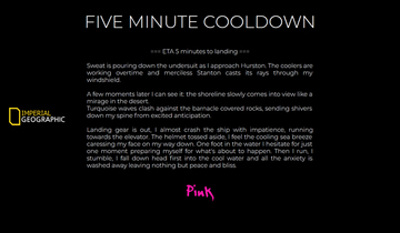 Landing gear is out, I almost crash the ship with impatience, running towards the elevator. The helmet tossed aside, I feel the cooling sea breeze caressing my face on my way down. One foot in the water I hesitate for just one moment preparing myself for what's about to happen. Then I run, I stumble, I fall down head first into the cool water and all the anxiety is washed away leaving nothing but peace and bliss.