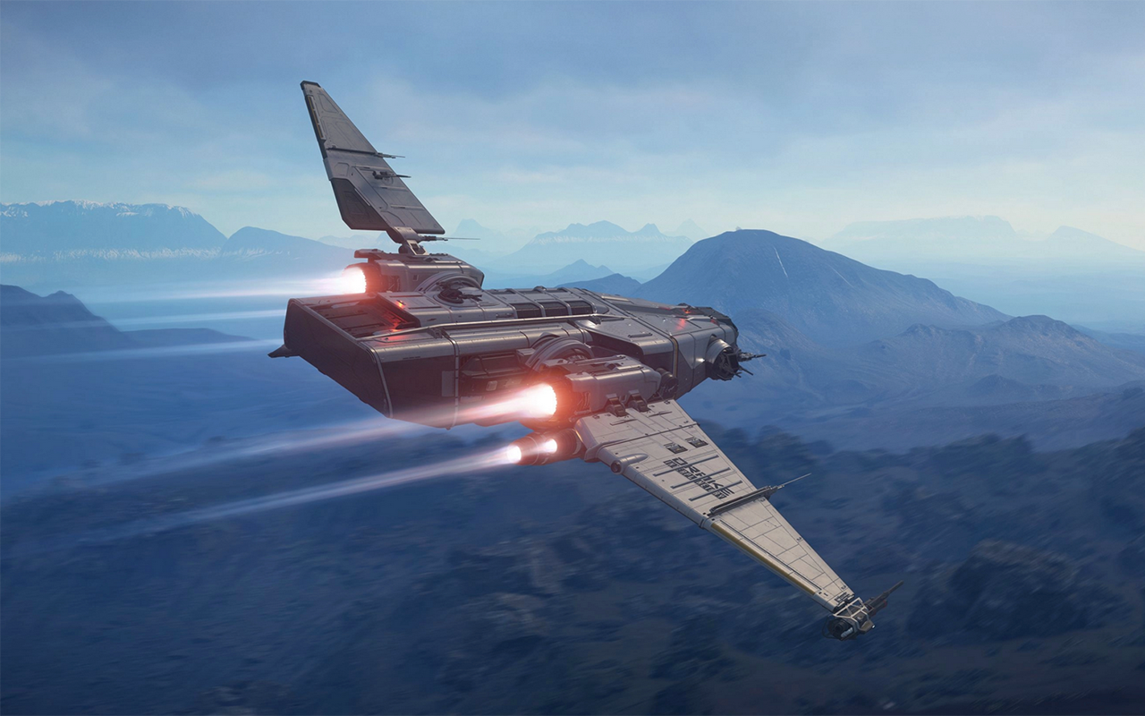 The Corsair is a multi-crew expedition spacecraft manufactured by Drake Interplanetary. Capable of supporting a crew of up to four people, it is outfitted with living quarters that include a full kitchen and washroom facilities. Each Corsair comes with a cargo bay that can accommodate a ground exploration vehicle or up to 72 SCU of cargo, and is equipped with cannon mounts on the bow, a manual turret, wing-mounted cannons, missiles, and an aft-facing remote turret. The Corsair also features a perpendicular cockpit configuration in which the co-pilot is seated below the pilot.