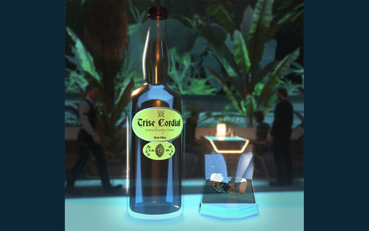 FLAVORTrise Cordial has a strong, characteristic taste: bitter and herbal with a sweet undercurrent as it contacts the palate, followed by salammoniac with a hint of pine upon swallowing. It is often served at room temperature in a cordial glass as an aperitif. Trise Cordial is used as an ingredient in place of bitters in some cocktails, such as the whiskey-based Trise Sling, a drink first made popular at the G-Loc Bar in Area18 on ArcCorp (Stanton III). Clair Rios of Cafe Musain in the Nyx system takes credit for the recipe, claiming that bartenders working for G-Loc stole it when they passed through Delamar in 2911.