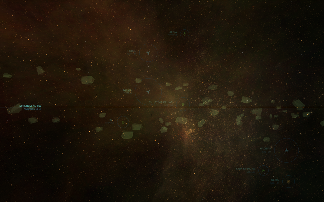 The Tohil belt alpha is an asteroid belt in the Tohil system, United Empire of Earth (UEE). Dense with asteroids, travel conditions through it are dangerous enough that major mining companies in the UEE have declined to begin operations there. Smugglers and other outlaws who are especially skilled at piloting and navigation have been known to hide in the belt, but most choose not to risk their ships and lives and give it a wide berth.