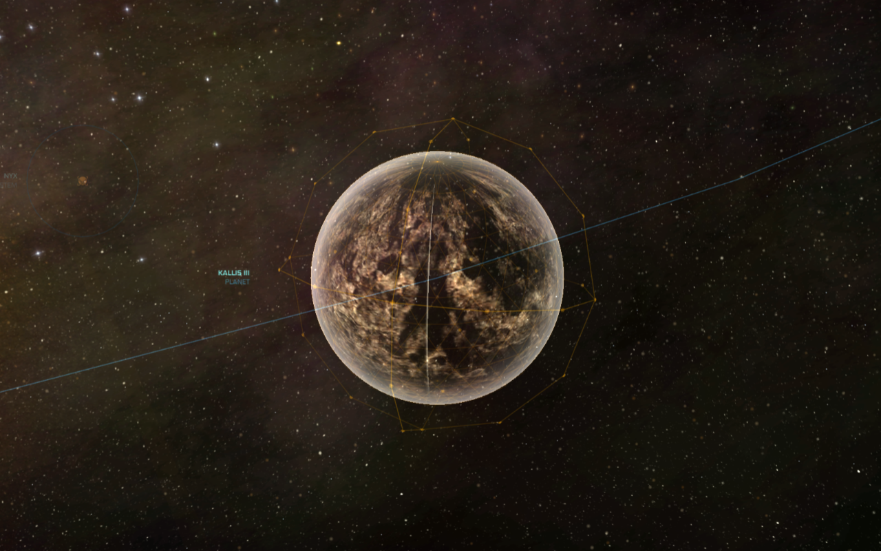 Kallis III is a terrestrial planet in the developing Kallis system that shares an orbit with another planet, Kallis II. More massive than its sibling planet, it is also accruing matter at a higher rate, and is expected to continue increasing in size. Observing scientists believe that it may one day grow large enough to subsume Kallis II.